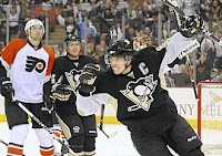 The newly formed PP with Geno rocking the left point and Kunitz/Guerin screening the goalie was quite effective in the 1st goal. They moved the puck around and Crosby had a wide open net to shoot at. The Flyers can fight but they didn't seem to bring that physical edge that helps them win games tonight. They wanted to play run and gun and it failed miserably.